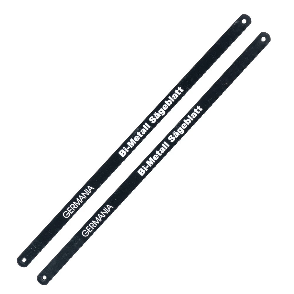 2 Bi-Metall Sägeblätter 300 mm von GERMANIA im Set. Die Sägeblätter aus Bi-Metall sind für kleine Bogensägen geeignet und sorgen für ein einfaches und reibungsloses Sägen mit guter Schnittqulität.