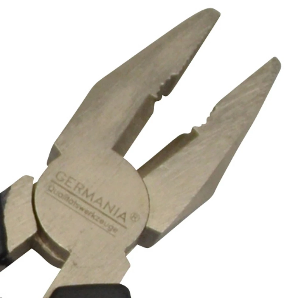 Die Kombinationszange (Kombizange) von GERMANIA vereint mehrere Funktionen in sich und ist damit ein wahres Allround-Werkzeug. Sie dient zum Greifen und auch zum Abschneiden von DrÀhten. Zum Schneiden besitzt sie eine seitliche Schneide wie ein Seitenschneider, hat flache Backen wie eine Flachzange und ein Brennerloch wie bei einer Rohrzange zum Festhalten von runden Objekten wie z.B. Schraubenköpfen.