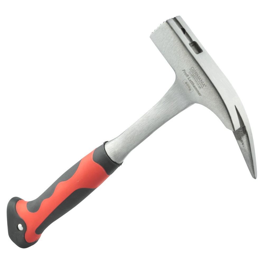Latthammer von GERMANIA mit magnetischer Nagelbahn und Klaue zum Herausziehen von NÀgeln. Der verlÀngerte Klauenzahn mit Spitze kann in Holz eingeschlagen werden, um schwere Holzlatten sicher zu bewegen. Der Latthammer kommt hauptsÀchlich im Holzbau zum Einsatz.