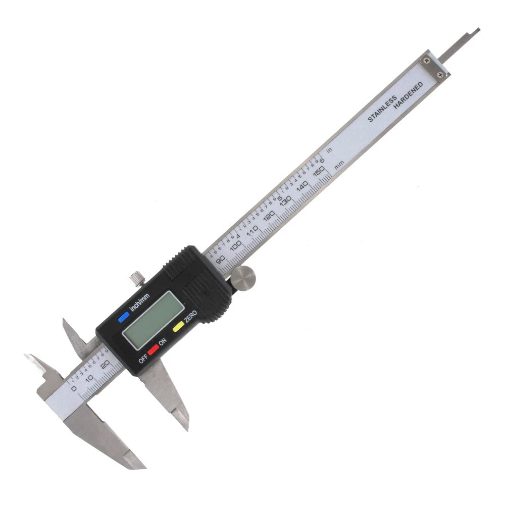 Die digitale Schieblehre mit LCD-Display eignet sich zum Messen von Innen-, Außen und Tiefenmessungen. Der Messbereich dieser Messlehre ist 150 mm mit einer Messgenauigkeit von 0,1 mm. Die Anzeige mit Null-Taste ist zwischen mm und inch umschaltbar. Dank der Feststellschraube werden die Messbacken fixiert, um genaue Messungen zu gewährleisten.